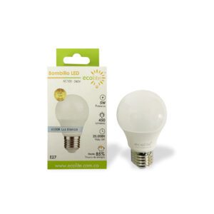 Bombillo LED tipo incandescente 5 Watts Ecolite ha sido construido con materiales resistentes a golpes y vibraciones. Su difusor es en policarbonato opalizado que mejora la distribución de la luz, el cuerpo o chasis es en aluminio recubierto por plástico y en su interior se encuentra el circuito con los chips led sobre una plaqueta en aluminio, finalmente su rosca E27 firmemente asegurada para evitar desprendimientos.