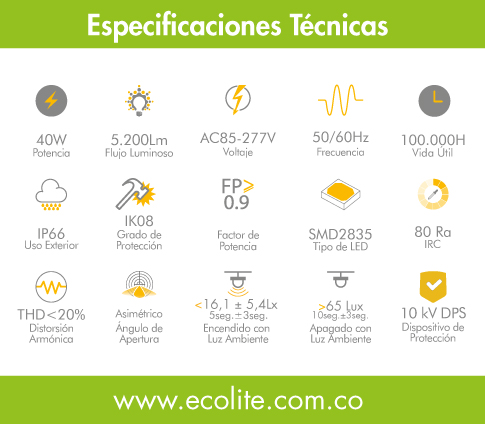• Equipada con fotocelda de 3 pines, permite el encendido automático al anochecer y el apagado al amanecer, aportando eficiencia energética y reducción de mantenimiento.