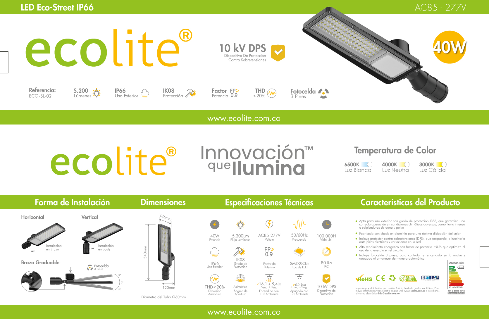• La Luminaria LED 40W de Ecolite está diseñada para ofrecer un rendimiento óptimo en vías urbanas, zonas residenciales, parques y avenidas, garantizando una iluminación uniforme y segura.