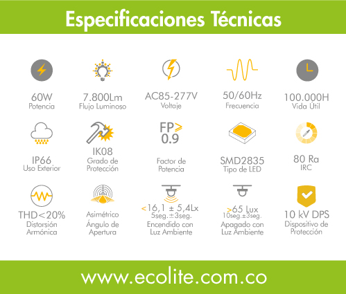 • La Luminaria LED 60W de Ecolite ha sido desarrollada para ofrecer un rendimiento confiable y duradero en proyectos de iluminación vial, urbana, industrial o residencial, garantizando una cobertura uniforme y una excelente reproducción de color.