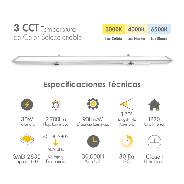 • Luminaria lineal LED 30W 3CCT, ideal para crear ambientes modernos y bien iluminados en espacios interiores.