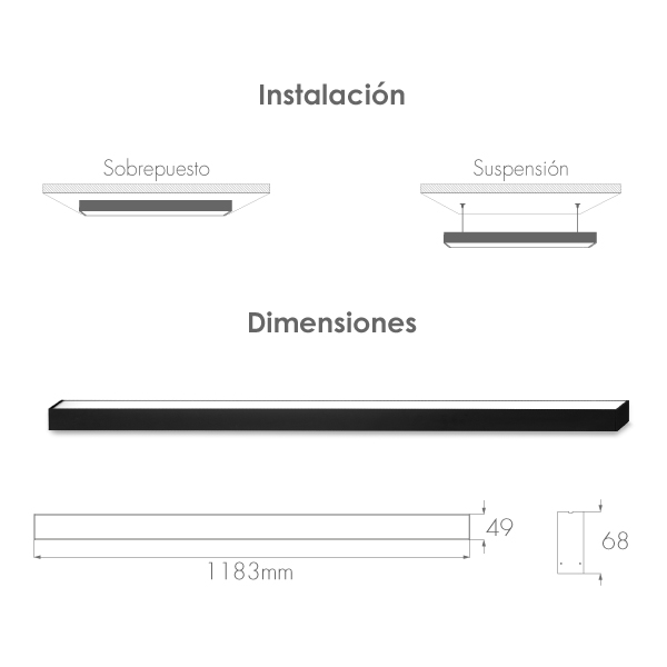 • Diseñada para montarse sobrepuesta o suspendida, lo que permite integrarla en proyectos decorativos, comerciales o corporativos con facilidad.