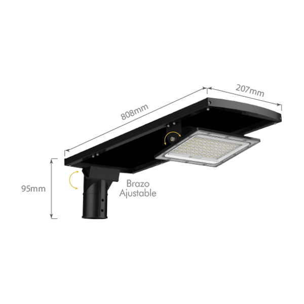 • Gracias a su brazo ajustable de 90° a 180°, puede orientarse estratégicamente para aprovechar al máximo la luz solar. No requiere cableado ni mantenimiento constante, lo que la convierte en una opción práctica y ecológica para iluminación pública, residencial o industrial exterior.