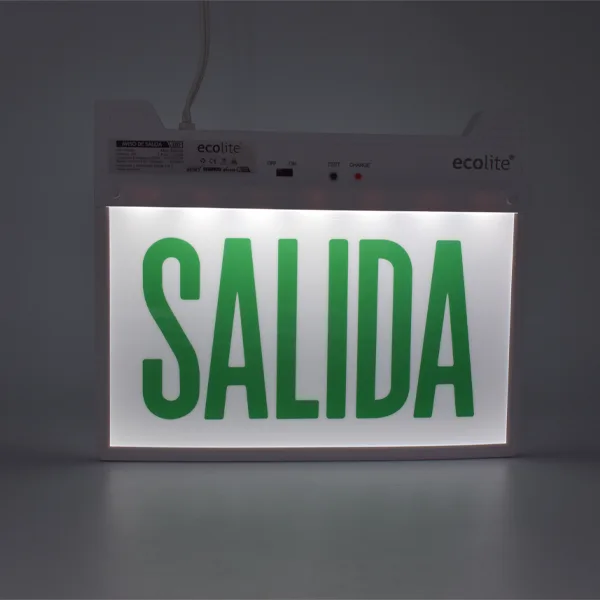 El aviso de salida LED 2W Ecolite está fabricado en plástico inyectado ignífugo, ideal para entornos que requieren señalización segura y resistente. Funciona conectado a corriente AC100-277V y cuenta con un sistema que cambia automáticamente a batería de 3.6V en caso de emergencia.