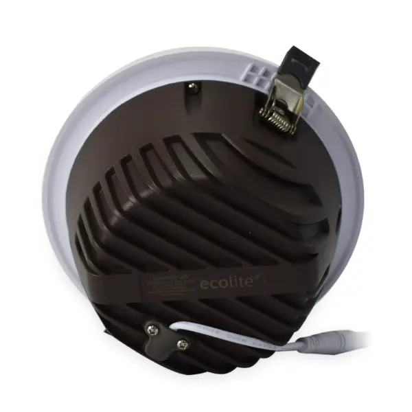 Bala LED DownLight 24W ecolite®, está construida en aluminio fundido para mejora la disipación del calor, esto permite cumplir con el tiempo de vida útil prometido de 30.000 horas. La característica más destacada es la implementación de los chips LED en la parte trasera de forma directa (tipo backlight), este sistema ha permitido desarrollar paneles de diámetros reducidos con mayor potencia.