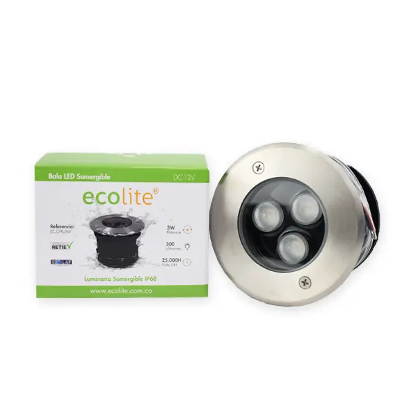 Bala sumergible LED Ecolite 3W – IP68, es un producto diseñado para iluminar bajo el agua, sin sufrir afección alguna, su chasis está construido con materiales resistentes a la corrosión, de larga duración que garantizan su funcionamiento, trabaja a bajo voltaje y se instalan incrustado en pared o piso de piscinas o piletas, jacuzzi, fuentes de agua, cascadas ornamentales, etc.
