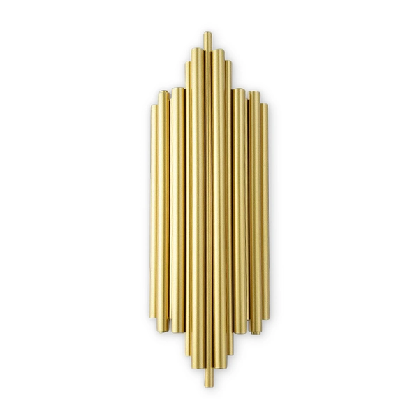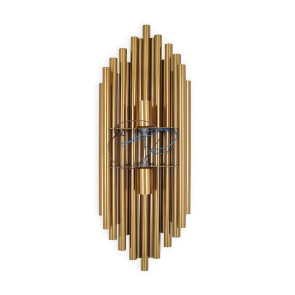 El aplique de pared destaca por su diseño elegante con varillas de aluminio verticales y chasis dorado, creando un efecto luminoso atractivo. Con dos roscas E12 en dirección vertical, brinda iluminación equilibrada y ajustable. Perfecto para salas, dormitorios y espacios interiores, aportando un toque sofisticado y cálido