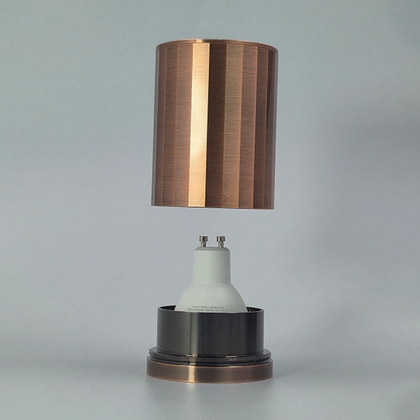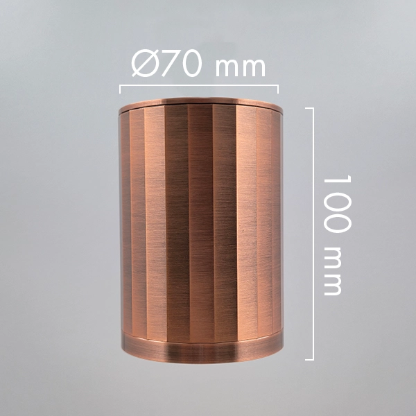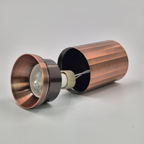 Bala cilíndrica para bombillo GU10 fabricada en aluminio texturizado color cobre, perfecta para iluminación de acento en espacios interiores. Su diseño elegante realza detalles arquitectónicos y decorativos, aportando calidez y distinción a cualquier espacio. Se instala de forma sobrepuesta en techo e incluye socket GU10, tornillos y chazos plásticos. Soporta una carga nominal máxima de 7W, combinando funcionalidad, resistencia y un estilo sofisticado para proyectos residenciales o comerciales.