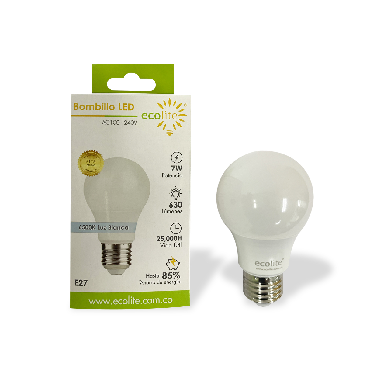 Bombillo LED tipo Incandescente 7 Watts Ecolite ha sido construido con materiales resistentes a golpes y vibraciones. Su difusor es en policarbonato opalizado que mejora la distribución de la luz, el cuerpo o chasis es en aluminio recubierto por plástico y en su interior se encuentra el circuito con los chips led sobre una plaqueta en aluminio, finalmente su rosca E27 firmemente asegurada para evitar desprendimientos.