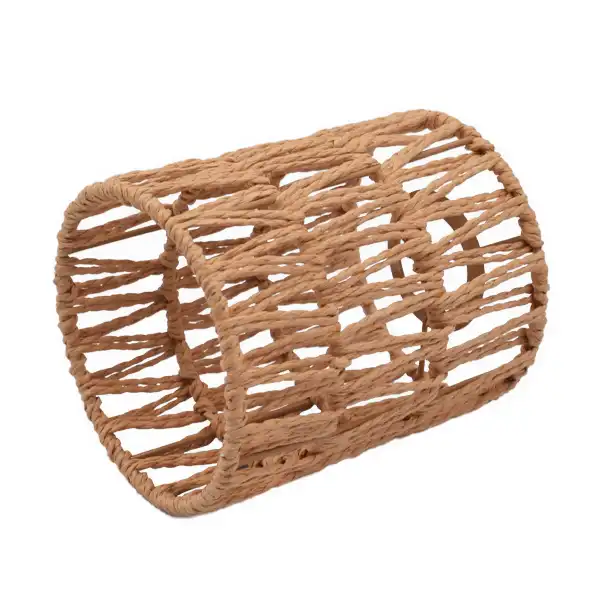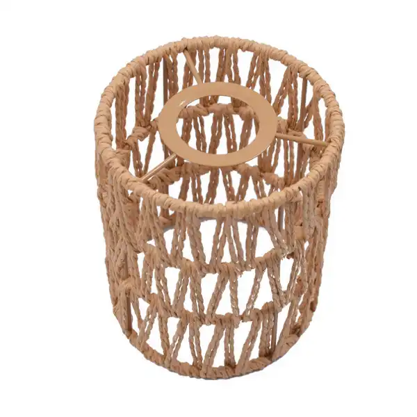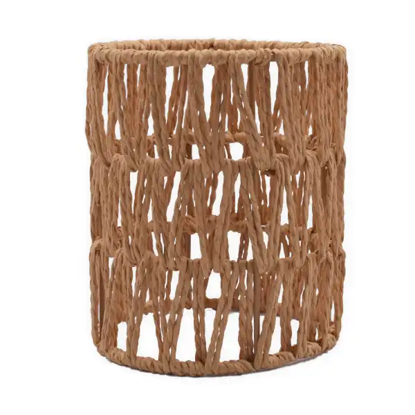 La caperuza artesanal tipo cilindro está elaborada en fibras naturales y presenta un acabado tejido en color marrón. Su diseño permite usarla como pantalla colgante o lámpara de mesa, adaptándose fácilmente a diferentes estilos decorativos.