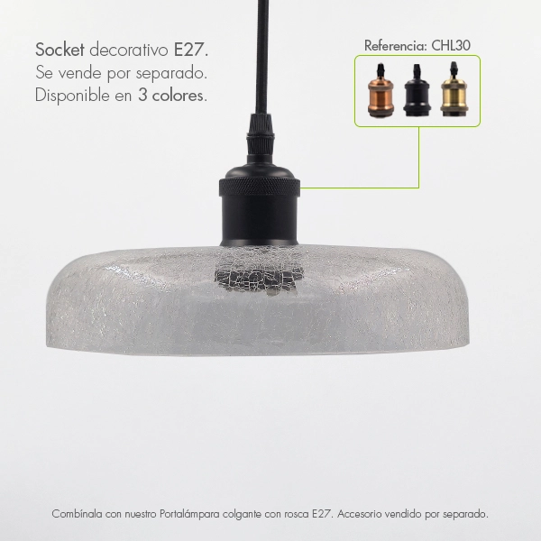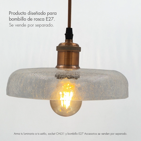 Caperuza de vidrio craquelado traslúcido con forma cilíndrica aplanada, ideal para difundir la luz de manera uniforme y crear un efecto decorativo elegante. Su acabado craquelado añade textura y estilo único, adaptándose a diferentes ambientes y tipos de luminarias. Perfecta para proyectos de iluminación decorativa donde se busca combinar funcionalidad y estética con un diseño moderno y sofisticado.