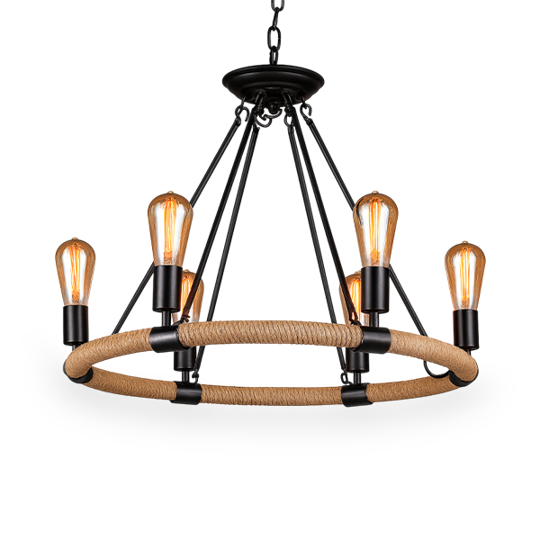 • Luminaria colgante tipo chandelier rústico, con aro circular revestido en yute natural.